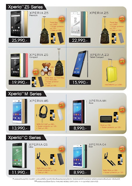 - รับของสมนาคุณพิเศษ กระเป๋าล้อลากมูลค่า 2,890 พร้อมทั้งฟิล์มกันรอย และเคสมือถือ สำหรับรุ่น Xperia Z5 series